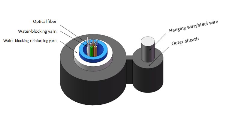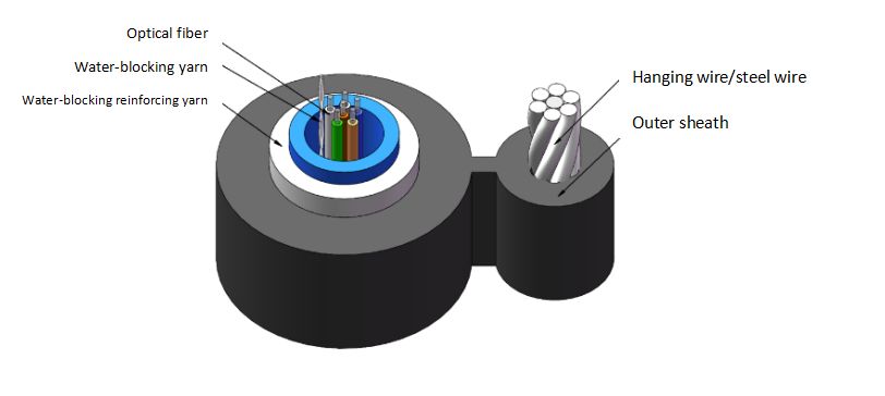 ऑप्टिकल केबल की संरचना सिंगल-मोड या मल्टी-मोड ऑप्टिकल फाइबर को एक ढीले ट्यूब में डालना है जो उच्च मापांक प्लास्टिक से बना है जिसमें पूरी तरह से सूखे प्रकार में पानी-अवरुद्ध यार्न और पानी-अवरुद्ध सामग्री से भरा होता है, और इसे केबल के केंद्र में रखें। ढीली ट्यूब के चारों ओर, पानी-अवरुद्ध सुदृढीकरण यार्न (जैसे ग्लास यार्न, अरामिड यार्न और अन्य गैर-धातु यार्न सामग्री, आदि) रखा जाता है, और फिर एक पॉलीइथिलीन (या अन्य प्लास्टिक या लौ-मंदक प्लास्टिक, आदि) म्यान को बाहर निकाला जाता है और लपेटा जाता है। साथ ही, केबल बनाने के लिए स्टील स्ट्रैंड या सिंगल राउंड स्टील वायर सस्पेंशन वायर जोड़े जाते हैं।