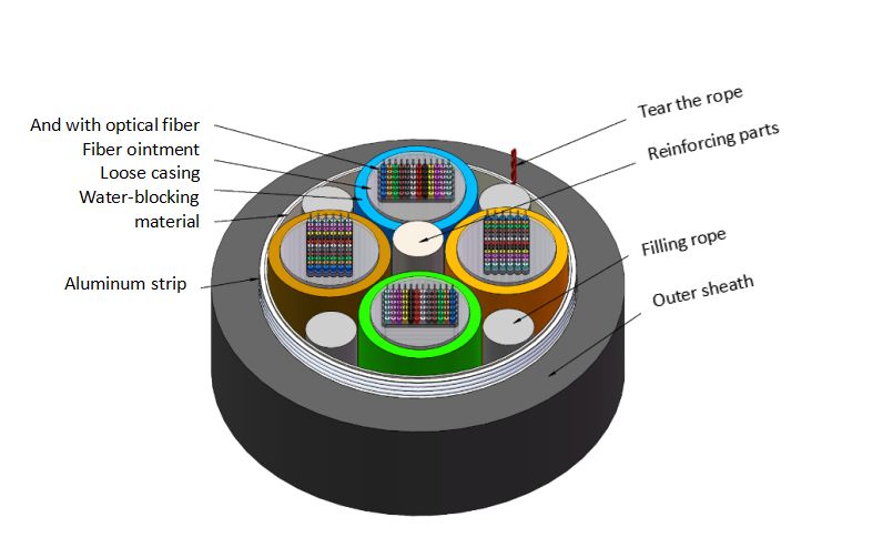 ऑप्टिकल केबल की संरचना उच्च मापांक प्लास्टिक से बनी एक ढीली ट्यूब में सिंगल-मोड या मल्टी-मोड ऑप्टिकल फाइबर टेप को सम्मिलित करना है और इसे वाटरप्रूफ कंपाउंड से भरना है। केबल कोर का केंद्र एक धातु सुदृढ़ करने वाला भाग है। कुछ निश्चित कोर संख्या वाले ऑप्टिकल केबलों के लिए, धातु केंद्रीय सुदृढ़ करने वाले भाग के बाहर एक पॉलीइथिलीन पैड परत को बाहर निकाला जाता है। ढीली ट्यूब (और भरने वाली रस्सियाँ) एक कॉम्पैक्ट और गोल केबल कोर बनाने के लिए केंद्रीय सुदृढ़ करने वाले सदस्य के चारों ओर मुड़ी हुई हैं। केबल कोर के अंदर के अंतराल को पानी-अवरोधक यौगिक से भरा जाता है, और केबल बनाने के लिए बाहर एक एल्यूमीनियम-पॉलीइथिलीन बंधुआ म्यान को बाहर निकाला जाता है।