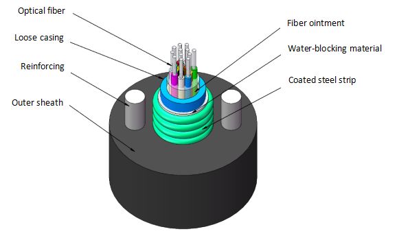 ऑप्टिकल केबल की संरचना सिंगल-मोड या मल्टी-मोड ऑप्टिकल फाइबर को एक ढीली ट्यूब में डालना है जो उच्च मापांक प्लास्टिक से बनी होती है जिसे वाटरप्रूफ कंपाउंड से भरा जाता है और इसे केबल के केंद्र में रखा जाता है। पानी अवरोधक सामग्री को ट्यूब के बाहर और स्टील स्ट्रिप के बीच रखा जाता है। दो समानांतर स्टील तारों को सुदृढ़ समर्थन के रूप में म्यान में एम्बेडेड किया जाता है, और बाहरी तरफ पॉलीइथिलीन बंधुआ म्यान के साथ बाहर निकाला और लपेटा जाता है ताकि केबल बन सके।